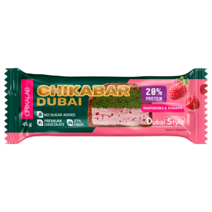 Chikalab Dubai 45 g — это премиальный протеиновый батончик с восточной тематикой. Он сочетает натуральные ингредиенты и оригинальные вкусы — грецкий орех, малину, моккачино и хрустящее тесто катаифи, обеспечивая насыщенный, но лёгкий перекус.